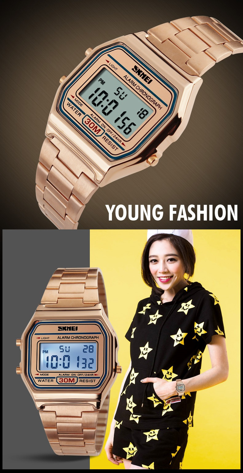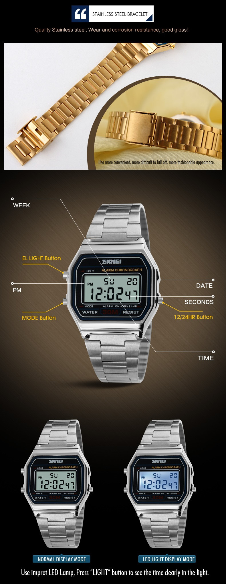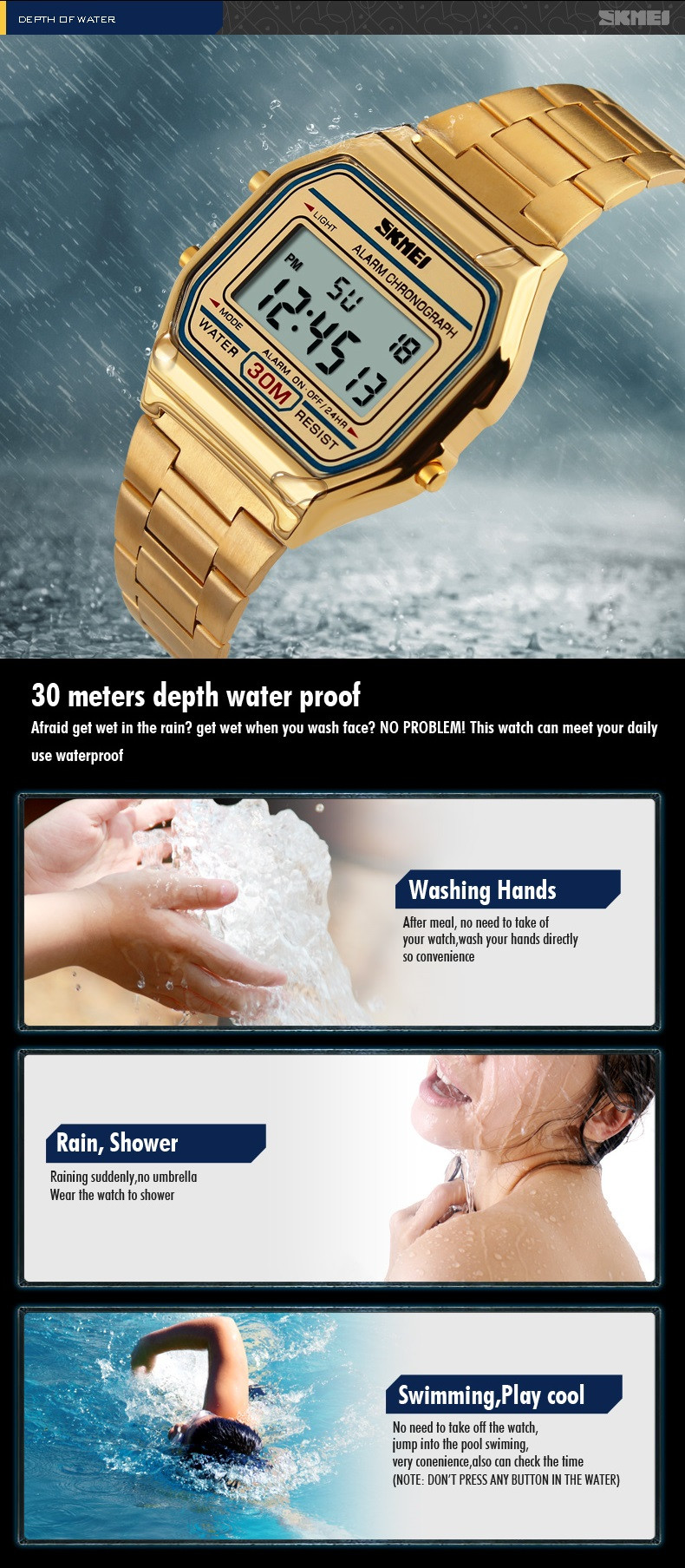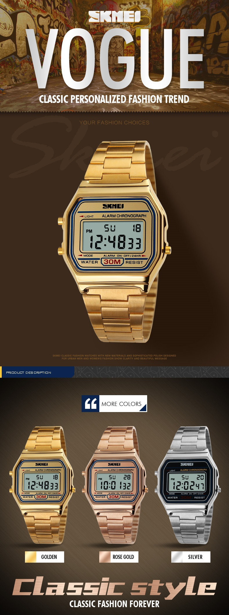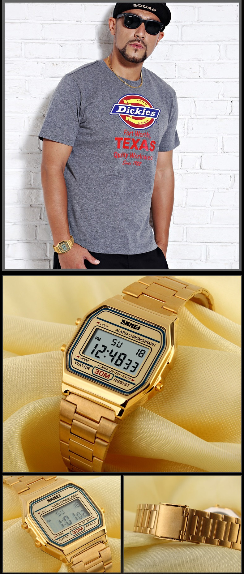 SKMEI Luxury Brand LED Digital Sport Watch Fashion Casual Gold Wrist Watch Men Stainless Steel Military Waterproof Wristwatches