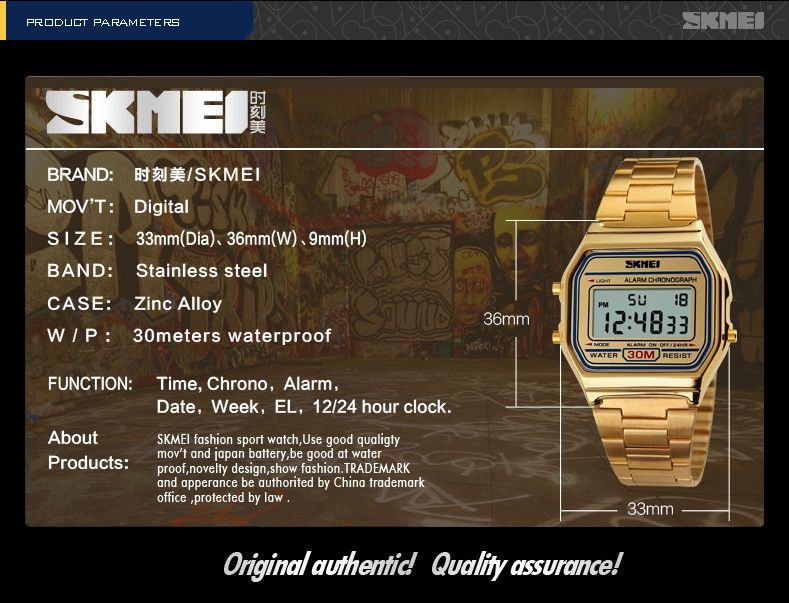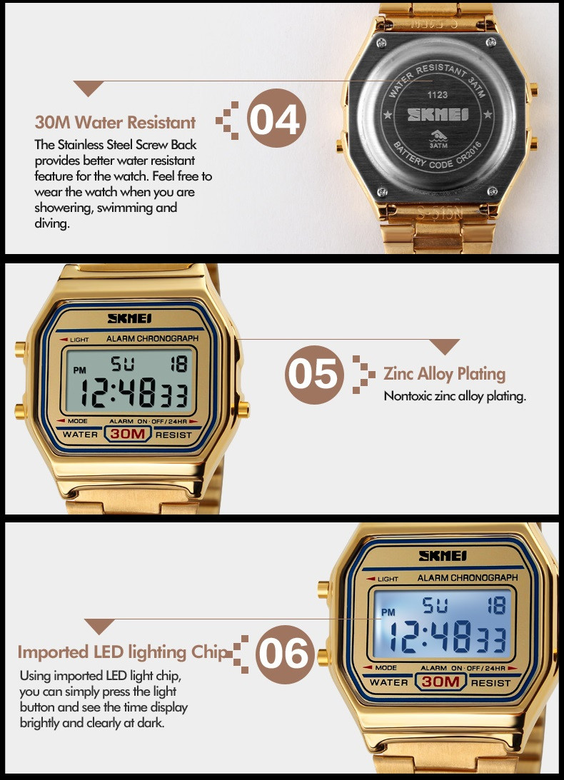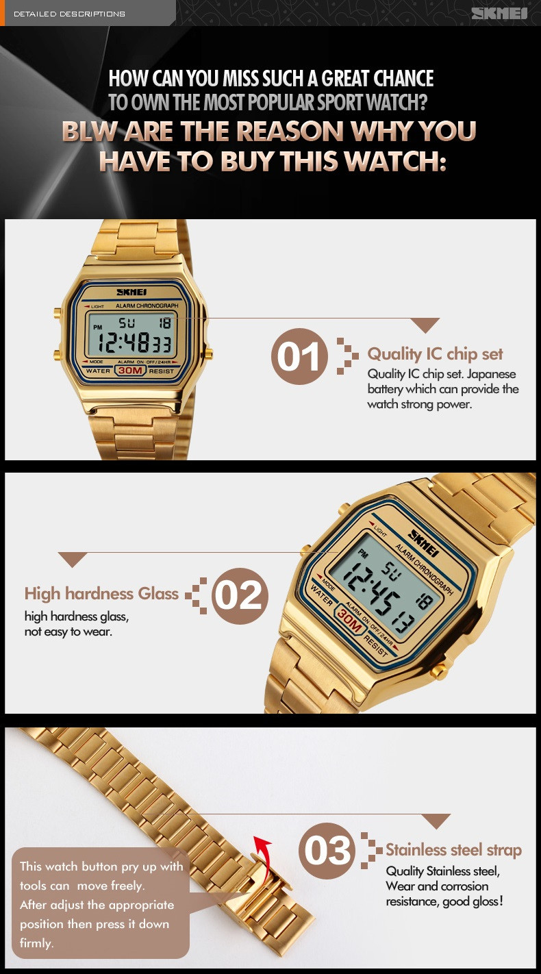Be the first to review “SKMEI Luxury Brand LED Digital Sport Watch Fashion Casual Gold Wrist Watch Men Stainless Steel Military Waterproof Wristwatches”